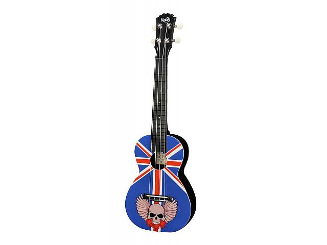 Концертная укулеле из поликарбоната с гитарными колками. Цвет: черные нижняя дека и обечайки, верхняя дека - британский флаг c крылатым черепом.